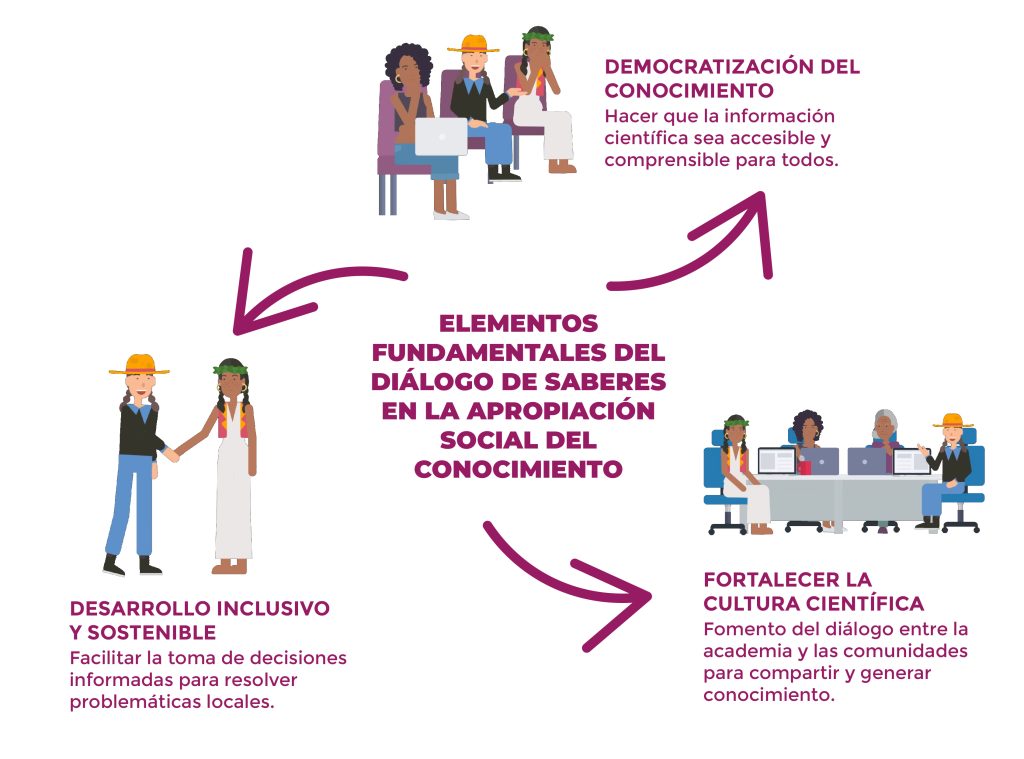 El diálogo de saberes en la Apropiación Social del Conocimiento (ASC) es un proceso de intercambio de conocimientos y experiencias entre diferentes actores de la sociedad, como comunidades locales, académicos, y organizaciones. Este enfoque reconoce y valora los saberes y prácticas de las comunidades, especialmente aquellas históricamente marginadas, como las rurales, indígenas y afrocolombianas, a la par del conocimiento científico.