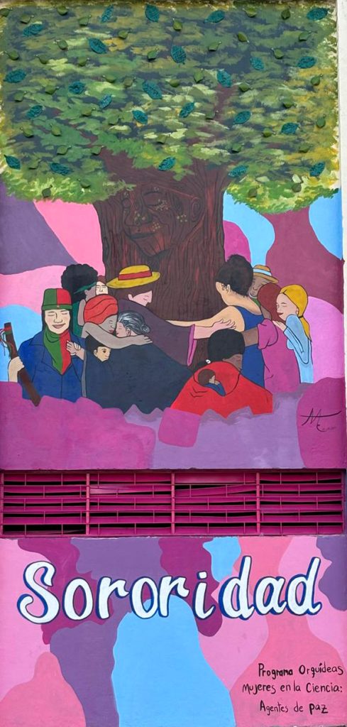 En el Coliseo Los Fundadores de Florida, las mujeres rurales, el grupo de investigadoras y la artista plástica Aura Angelica Cortés junto con su equipo de artistas, hemos dejado huella en un mural que refleja las narrativas de las mujeres campesinas, indígenas y afrocolombianas, plasmando sus luchas y esperanzas en un espacio creativo lleno de colores y símbolos.